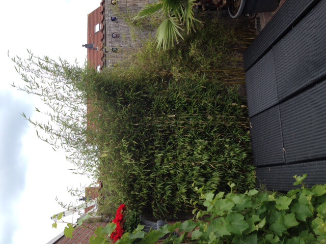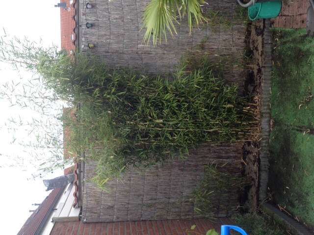 Links staat de Fargesia Rufa, in het midden Robusta en rechts latere aanplant Murielae. Moet ik nu de Rufa en Murielae totaal gaan verwijderen? Of loop ik nog kans dat Robusta zich zo gaat verspreiden dat hij door de andere soorten heen groeit?