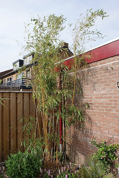Een van de 2 bossen die ik heb heeft 21 nieuwe scheuten gevormd en die staan allemaal in of tegen de 'pol' aan. (Een deel van deze scheuten is nu rond de 1,7 meter.) Maar ik ga er toch maar vanuit dat het P. aureosulcata is. En dus zal ik deze maand zo'n bescherming tegen het woekeren aanbrengen.