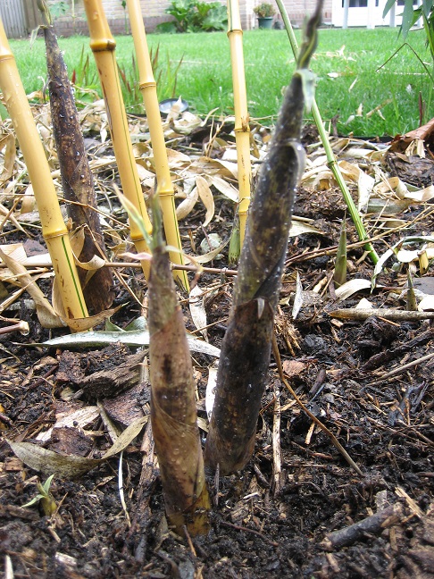 Maar zelf zou ik de dunste scheuten er tussenuit knippen. Maar dat puur omdat het mooier is. Dat zijn dan voornamelijk scheuten van vorige jaren maar ook de allerdunste sprietjes van dit jaar. Omdat ik een keer heb meegemaakt dat de bamboe begon te bloeden na het wegbreken van scheuten en onderste takjes toen ze nog niet verhout waren, snoei ik tegenwoordig pas als alles wat steviger is. Bovendien kunnen de volwassen stelen dan nog energie leveren aan de scheuten in groei, totdat de nieuwe scheuten blad hebben.