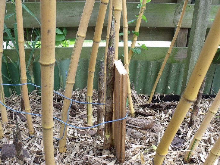 Bij mij komen de scheuten ook scheef uit de grond en groeien ook wat scheef. Het zijn dunne scheuten dus ik verwacht toch dat die over een paar jaar verwijderd gaan worden. Ik doe dat nu niet, omdat 1) Het de eerste scheuten zijn en 2) Ik ergens had gelezen dat je de bamboe het beste de eerste 3 jaar met rust kunt laten.