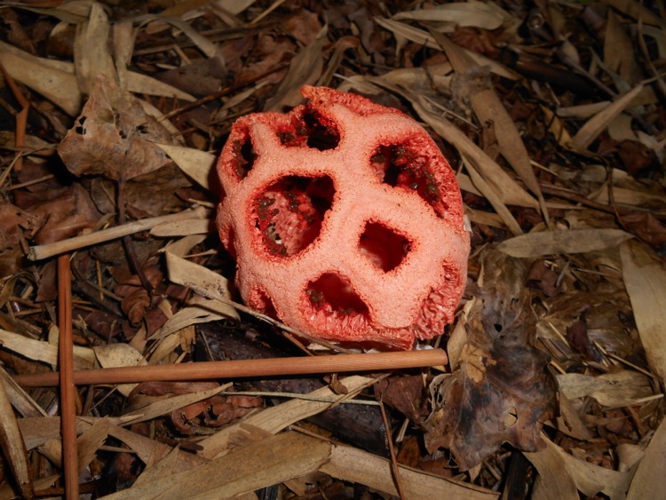 Tijdens bezigheden in de tuin vandaag werd mijn aandacht getrokken door een aasgeur. Meestal ligt er dan ergens een dode kikker of vogel te stinken. Bij een nadere inspectie bleek de oorzaak echter een drietal knaloranje vruchtlichamen van de traliestinkzwam (Clathrus ruber) een exotische fungus die thuishoort in de subtropen, maar die in Nederland steeds vaker opduikt. Hier in de tuin groeit deze zwam op de plek waar vorig jaar Fargesia scabrida is gerooid om plaats te maken voor een Trachycarpus wagnerianus. De gesnoeide bamboehalmen zijn toen verhakseld en rondom de palm gestrooid. Van de traliestinkzwam wordt gezegd dat deze een 'liaison' heeft met 'zwarte bamboe'. Blijkbaar neemt deze ook genoegen met een andere soort.