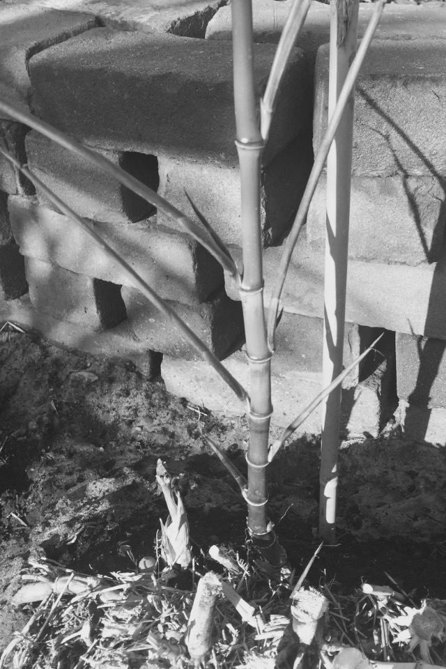 Zo 'n bamboehalm bevat in aanleg al de segmenten die tijdens de strekkingsgroei boven de aarde verschijnen. Naarmate de condities daarvoor gunstiger zijn, i.e. warmte en voldoende water. groeien de leden tussen de knopen langer uit en verkrijgt de halm de uiteindelijke hoogte. Omdat deze Phyllostachys aureosulcata 'Spectabilis' kort geleden is aangeplant zullen de eerste halmen nog niet zo hoog opgaan. De geringe tussenafstand van de onderste knopen duidt daar op. De strekkingsgroei stopt zodra het schutblad afvalt waarna de zijtakken verder uitgroeien. Om dikkere en hogere halmen te genereren, worden dunne en zwakke halmen in het vroege voorjaar verwijderd. Dat geldt ook voor aftakelende halmen na ± 5 jaar.