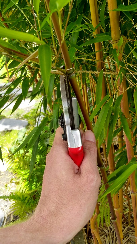 Ik snoei het onderste 1/4 tot 1/3 deel van de bamboe kaal, dat vind ik het natuurlijkst over komen.