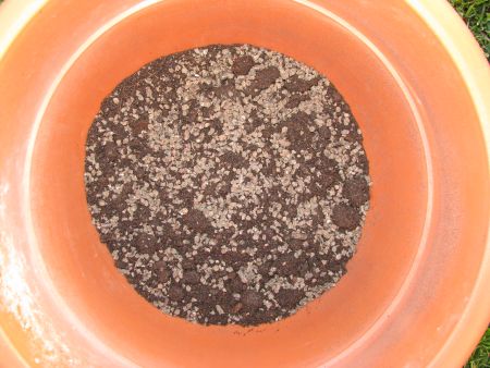 Eerst de pot vullen met goede potgrond en eventueel wat koemestkorrels