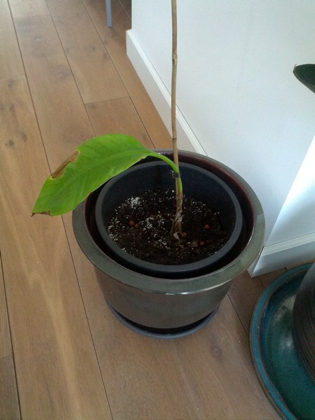Hij is dus op sterven na dood, maar ik probeer hem toch te redden, door hem te ondersteunen met een stokje en een klemmetje en hem iedere dag een beetje te besproeien, en hem lekker vochtig te houden. Hij staat in normale potgrond, met hydrokorrels onderin, en in de pot zitten gaten zodat overtollig water goed weg kan lopen. Na mijn terugkomst heb ik hem wat mest gegeven en hoop ik dat hij het gaat overleven. Ik zie in het stammetje wel een nieuw blad zitten, maar die komt er niet uit... :cry: