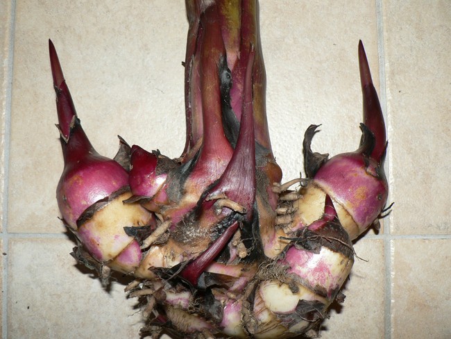 Ik heb ze week of twee buiten laten drogen onder overkapping, daarna paar dagen binnen laten drogen. alle zand er voor zover mogelijk afgeklopt/ uitgepeuterd. Daarna wortels verwijderd en in kranten gewikkeld in een bananendoos in de 100% droge kruipruimte gekieperd. Dit was anderhalve week geleden, ga ze aankom,end weekend checken op eventuele schimmel/rot en dan laat ik ze aan hun lot over tot het voorjaar.