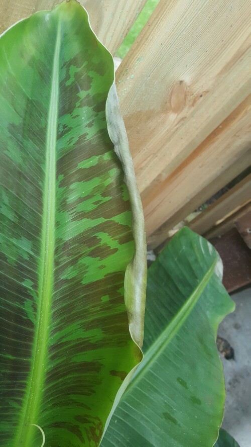 Ik lees al een tijdje mee op dit forum en ben hierdoor aardig interesseerde geraakt in musa's. Ik heb besloten om toch maar een account aan te maken, omdat ik met een vraag zit. Ik heb zelf 3 kleine basjoo's en een wat grotere Dwarf Cavendish en er viel mij iets op aan het laatste blad van mijn Cavendish (zie foto). Heeft iemand enig idee wat dit is. Het verscheen in de laatste fase van het ontrollen. Toen was de rand van het blad al heel zacht en het ziet er nu uit als op de foto.