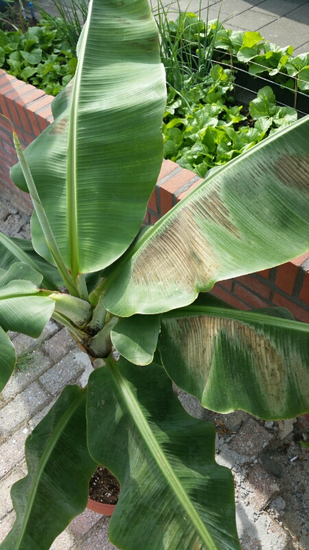 Dit ziet er inderdaad uit als verbranding door de zon. Best is een weekje in de schaduw zetten als planten van binnen komen. De nieuwe bladeren die gevormd worden zullen wel tegen het zonlicht kunnen. Ik gok dat dit een musa 'Dwarf Cavendish' is. Deze is eigenlijk een kamerplant, absoluut niet winterhard en kan eigenlijk enkel in de zomer buitengezet worden.