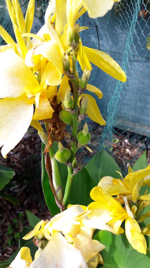 De groene, stekelige bolletjes zijn de onrijpe zaaddoosjes. Binnenin zitten mooi ronde knikkertjes, die momenteel nog wit zijn. De zaaddoosjes worden langzaam bruin en verdrogen. Daarna barsten ze open en zie je de (inmiddels zwart geworden) zaden zitten. Ze zijn dan rijp en je kan ze uit de zaaddoosjes wrijven. Je hoeft niet voorzichtig te zijn want de zaden zelf zijn bikkelhard.