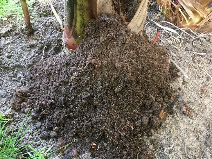 De plant drukt zich wat op als ie wat langer in de grond staat. Tevens komt de echte stam ook steeds hoger naarmate er steeds bladstelen afsterven. Het lijkt zelfs een beetje een verhoutte stam te gaan worden.