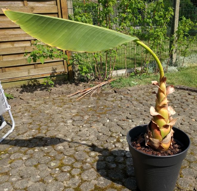 Newbie hier. Ik heb vorige lente een kleine musella lasiocarpa gekocht, toen had ie 1 blad. Er groeide om de 2-3 weken een nieuw blad bij, toen het koud werd heb ik'm binnen gezet met 3 bladeren eraan. De 2 oudste heb ik afgesneden toen ze verdorden, het jongste blad bleef groen en liet ik staan.