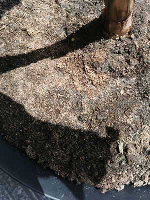 Kan ik het nu verhelpen door de bovenste laag weg te scheppen? Met wat voor spul kan ik het dan het beste aanvullen? Luchtige palmgrond, zand, stenen? Kan het überhaupt kwaad?