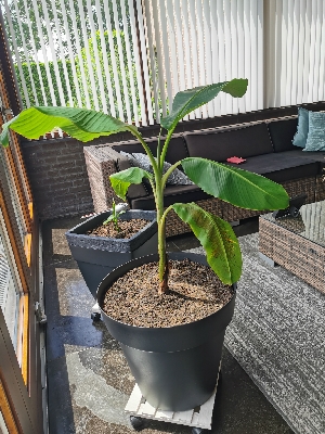 Vind dat je potgrond een lichte kleur heeft wat er op duid dat die toch vrij droog is, bananenplanten kluiten dienen altijd vochtig tot nat te zijn, je moet ook de hele kluit begieten dan drogen de randen ook niet zo snel in, dit laatste is sowieso een teken dat je te onregelmatig giet dit soort planten geef je mits ze goed groeien om de dag water, verder zie ik dat je erg grote potten gebruikt t.o.v. de plant dit heeft ook weinig zin, normaal als een plant koopt staat die in p.15/ p.20 en bij een volle wortelkluit verpot je dan naar een dubbele maat :mrgreen: