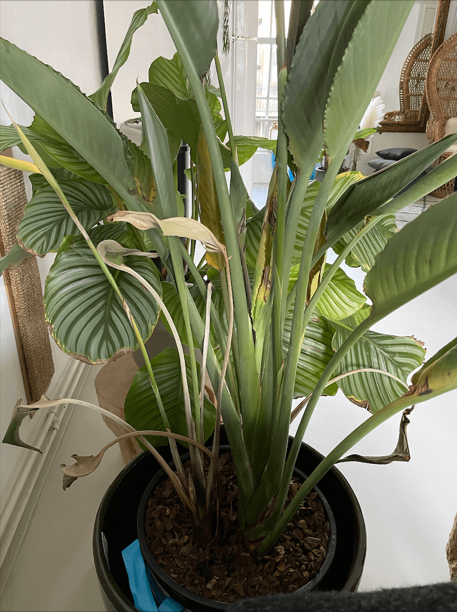 - Toen ik hem kocht waren de bladeren allemaal al een beetje dichtgevouwen, hoort dat? Heel anders dan de Strelitzia Nicolai's die ik heb, die mooie grote open bladeren hebben.