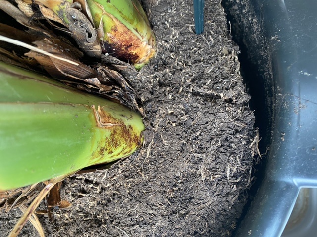 Hij staat niet in de volle zon maar wel bij een groot raam, grond is wel helemaal verhard, water neemt het nauwelijks op maar verpotten durf ik niet aan (ik woon alleen en de plant verplaatsen is al een helse klus).