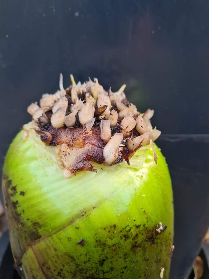 Vorig jaar had ik ook nog de bovenkant 50 cm ingekort, maar dit beviel me minder: je begint met een kortere plant en het duurt wel even voordat de hoogte is terug gewonnen. Ook was er wat rotting vanaf de bovenkant opgetreden die naar beneden was getrokken (zie eerdere foto's). Wanneer ik meer lengte behoud, zal het langer duren voordat de rot naar binnen trekt.