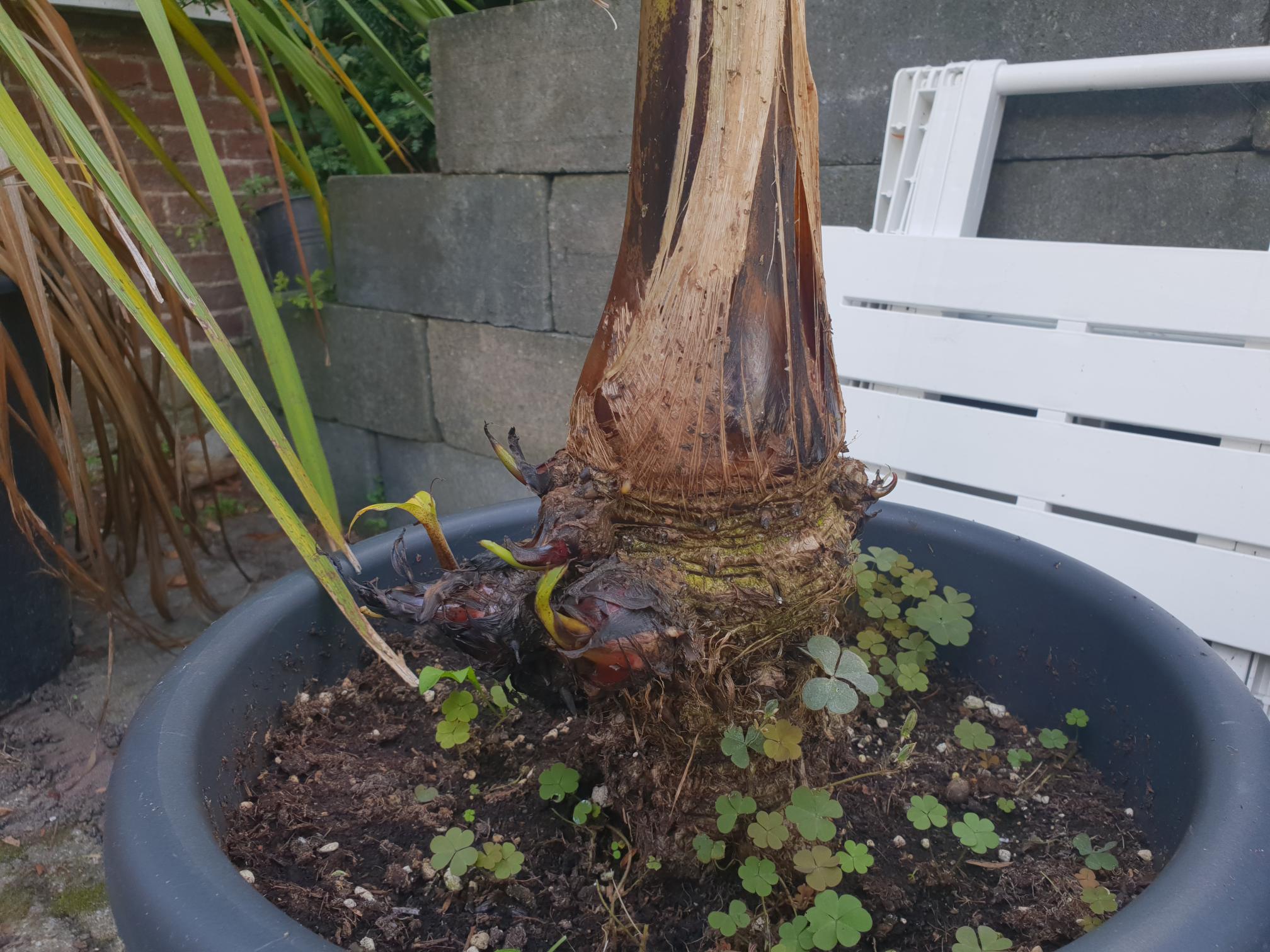 Deze jongen staat veel te ondiep. Hij mag zeker tot het dikke bruine deel van de stam in de grond.
