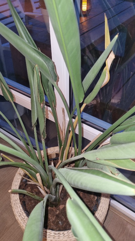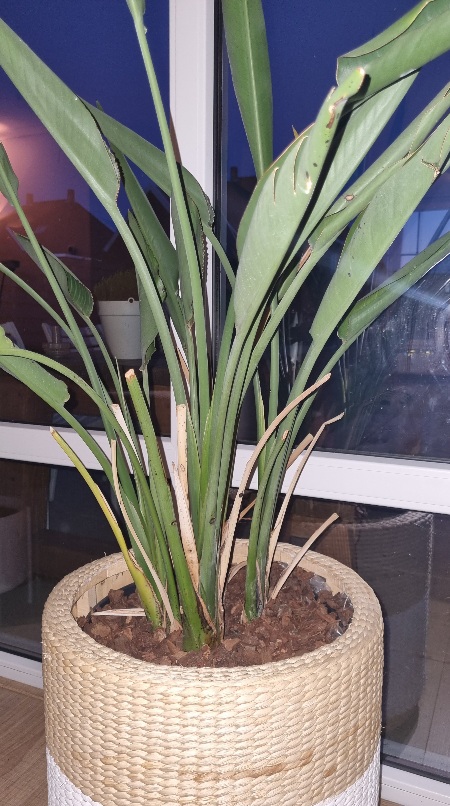Het lijkt erop dat die te droog staat, maar schijn bedriegt, moeilijk te beoordelen het substraat ziet er droog uit maar dat zegt niets dat ligt er bovenop, is het een gesloten pot? de streltzia heeft een pot met drainage nodig [waar het overtollige gietwater in een schotel kan lopen! ] volgens mij staat de zaak op Hydro korrels? en kan het ook zijn dat het boven te droog is en de wortels te nat staan ;)