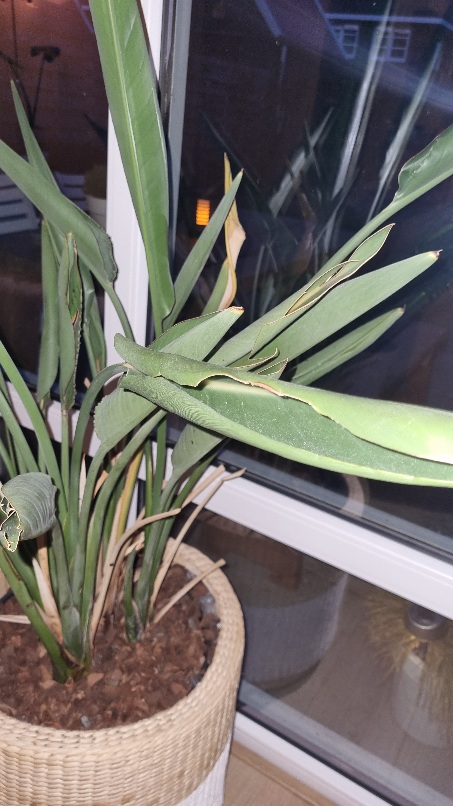 De bladeren van de Strelitzia krullen eigenlijk bijna allemaal.