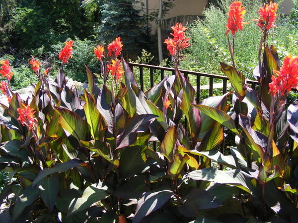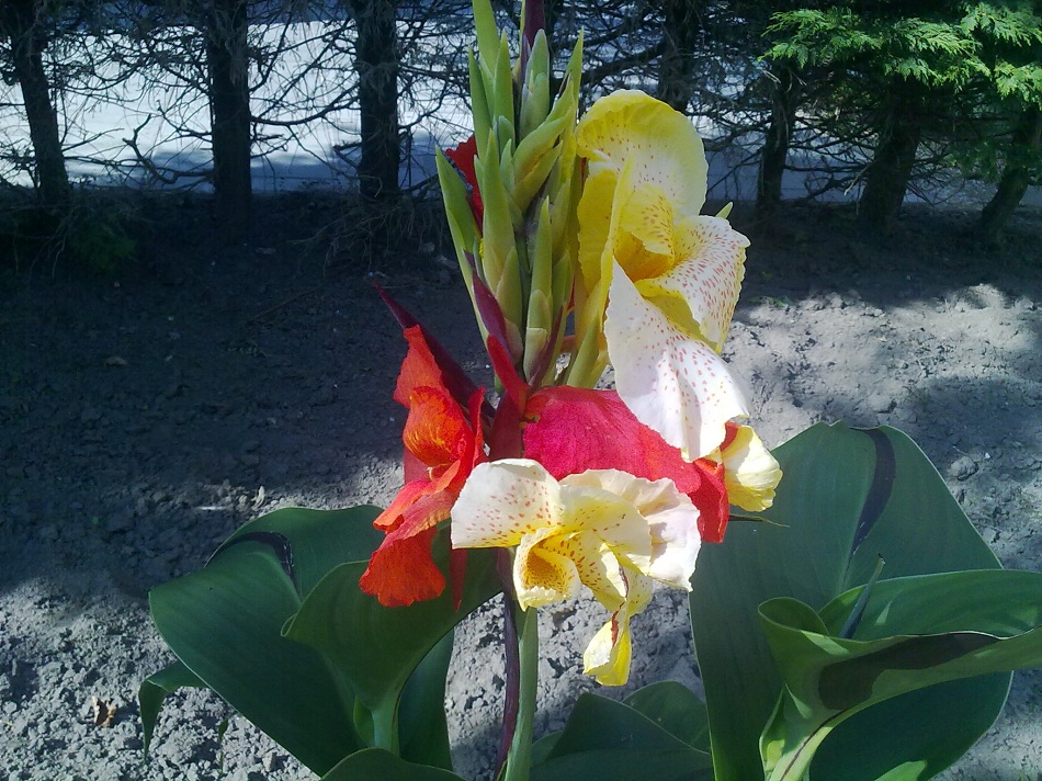 die heb ik door drieen gedaan en die heb ik eind april in tuin geplant en nu bloeien ze vollop ik heb nog nooit zulke grote bloeme gezien bij canna maar wat ik nog het mooist vind is dat hij bont is ene bloem geel ander oranje-rood hier paar fotos mischien weten julie welke soort dit is?