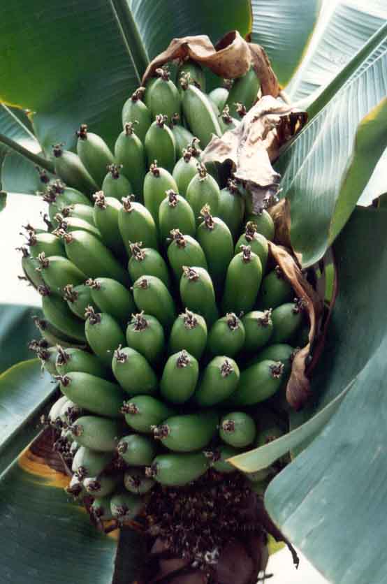ik heb twee foto's kunnen vinden die ik jaren terug ingescand had, en ze tonen de vruchten van de Cavendish, een foto met de tros aan de plant, een andere foto met de oogst op een bistrotafeltje van 1m breed (kwestie van de grootte te kunnen inschatten). Hopelijk zeggen de foto's jullie iets meer dan de tekst !
