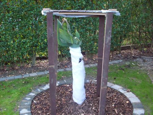 Dan zet ik een bekaertdraad van ongeveer 1 meter rond de stam (als je in 1 keer 2 meter hoog plaats kun je het geheel moeilijker opvullen met stro).