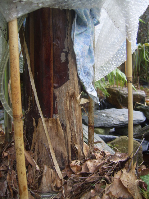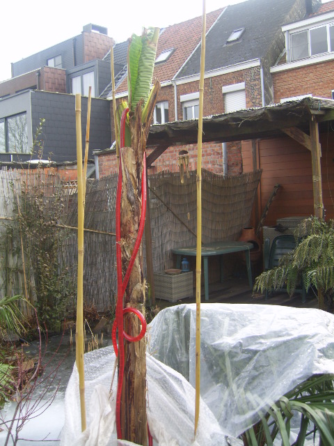 Omdat de Basjoo door het lang aanhoudende zachte weer tot zelfs eind Januari mooi bleven had ik besloten om toch één pol te gaan beschermen als testje en omdat ik het toch zonde vond om ze dan toch nog te verliezen, de stammen, nu dat ze al zo ver waren gekomen...