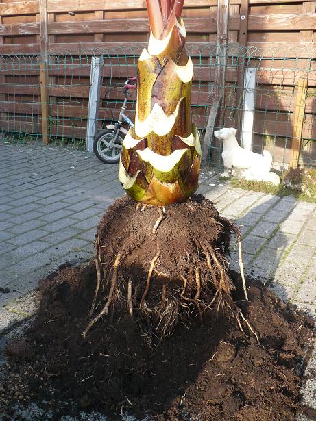 Ik pas hier eigenlijk helemaal niks toe. Ondanks dit toch hele smalle en Musa achtige bladeren. Heb het idee dat licht in dit geval slechts een beperkt aandeel heeft. Het blad is sinds uitplanten in de volle grond alleen maar meer op dat van een Musa gaan lijken. Zelfs een stuk kleiner en smaller als de bladeren die afgelopen winter in de donkere stalling gegroeid waren.