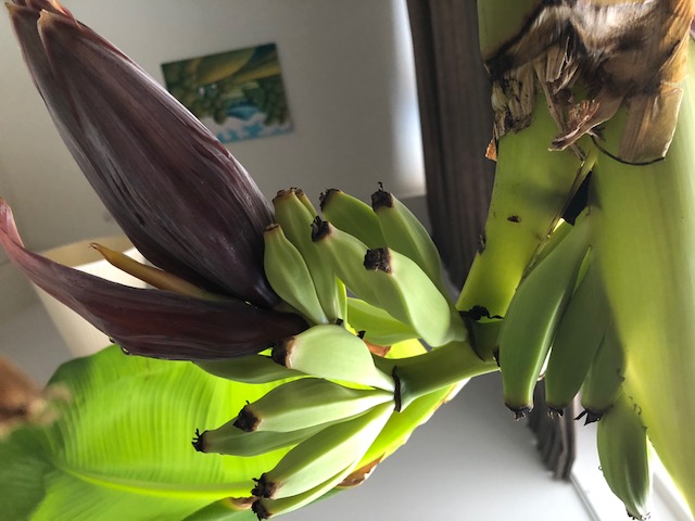Ik ben nog niet volledig wijs en iets ongeduldig dus al voor de 2e keer uitgepakt,heb ook minder planten en kleinere tuin. Ik rijd de opgepotte zo weer naar binnen bij onraad (vorst of te natte periode). De velutina bloeit nu, dat doet tie vanwege de warmte dus die ga ik niet stil zetten in de koude, dan groeit tie niet verder en gegarandeerd verlies ik mijn bloem en dus banaantjes