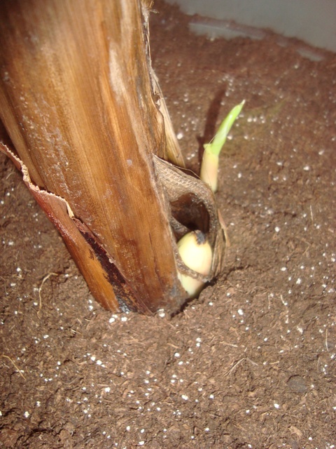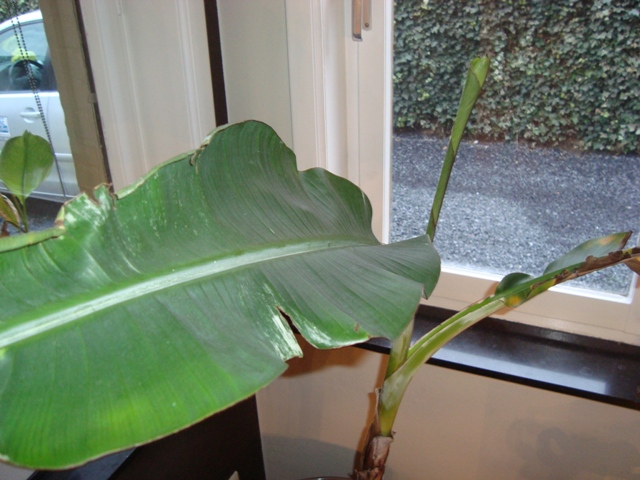 Het centraal blad is nu langzaam aan het open gaan, heb wel een paar bladeren verloren omdat er niet genoeg vocht kon worden opgenomen door de knol. Begin deze week kwam er echter een nieuw scheutje boven piepen....