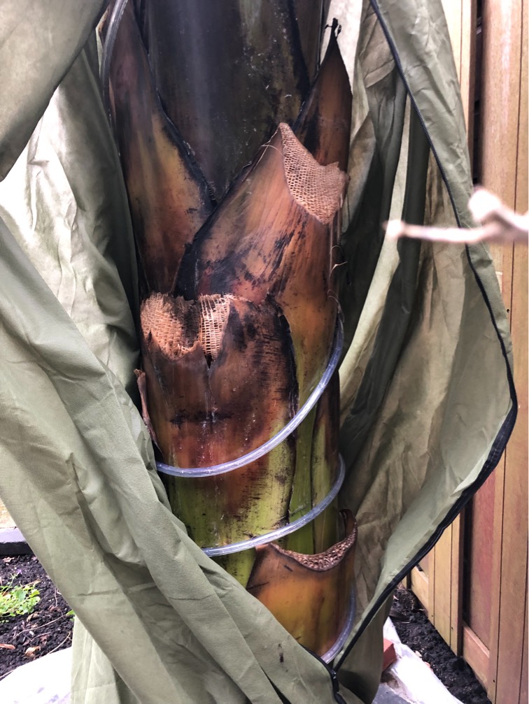 Vandaag mijn ensete op vergelijkbare manier ingepakt als vorig jaar. Om de stam een beetje grond weg gehaald, plastic neergelegd, turf erop met lichtslang om de stam, daar breed plastic omheen om de grond zo droog mogelijk te houden. Daarna vochtregulerende hoes om de plant. Bij zeer lage temperaturen zal er een extra vliesdoek laag onder de hoes komen.