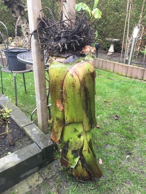 Nu is het door de storm van gisteren en vandaag een grote rafelpartij en is er 1 van de grote Musa sikkimensis stammen omgewaaid. Tevens staat de linker Ensete (waarvan 1 blad helemaal links op de foto staat) nu scheef.