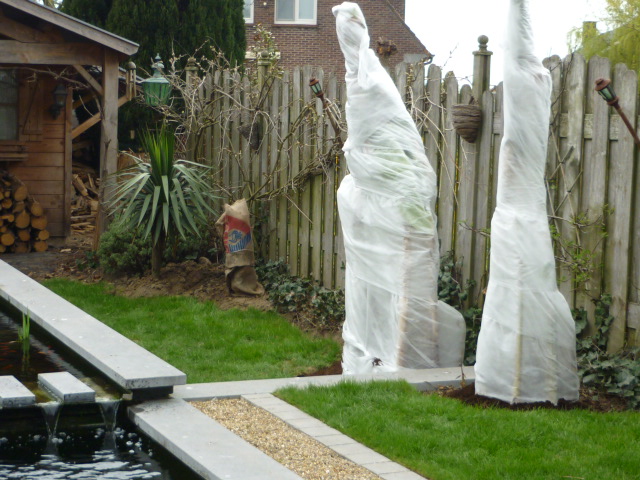 ikheb ze vroeger ook met stro gedaan en ook zonder sucses .ik graaf ze uit voor de eerste nachtvorst en zet ze droog in het geisoleerde tuinhuis en op 1 maart terug in de volle grond .indien er nog nachtvorst komt wikkel ik ze in met vliesdoek die ik toe niet . nu 8 april al bezig met tweede blad te ontrollen. ik ondervind wel dat ze traager groeien en bloeien dan dat ze in volle grond blijven staan maar dat vind ik het risico niet waard.
