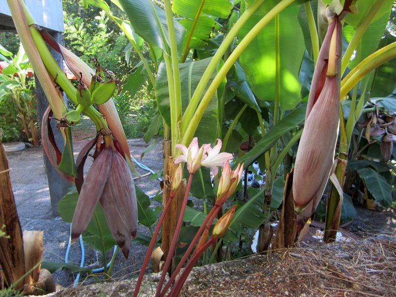 Beide stammen van Orinoco met daartussen Amaryllis belladonna. Foto is van 2 sept. Er zijn al wat banaantjes zichtbaar, maar deze zullen ws niet doorzetten omdat de stammen te weinig bladeren hebben.