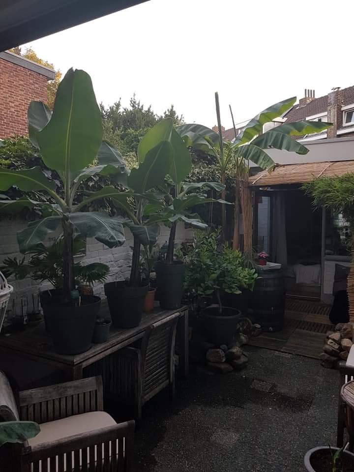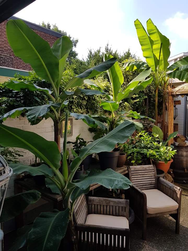 Super hoe de Cavendishes groeien in dit warme weer! Weer een waaier eruit! Stamlengte = 80 cm, totale hoogte plant 170 cm + pot 2m!! Met bladeren van 90 x 50 cm al