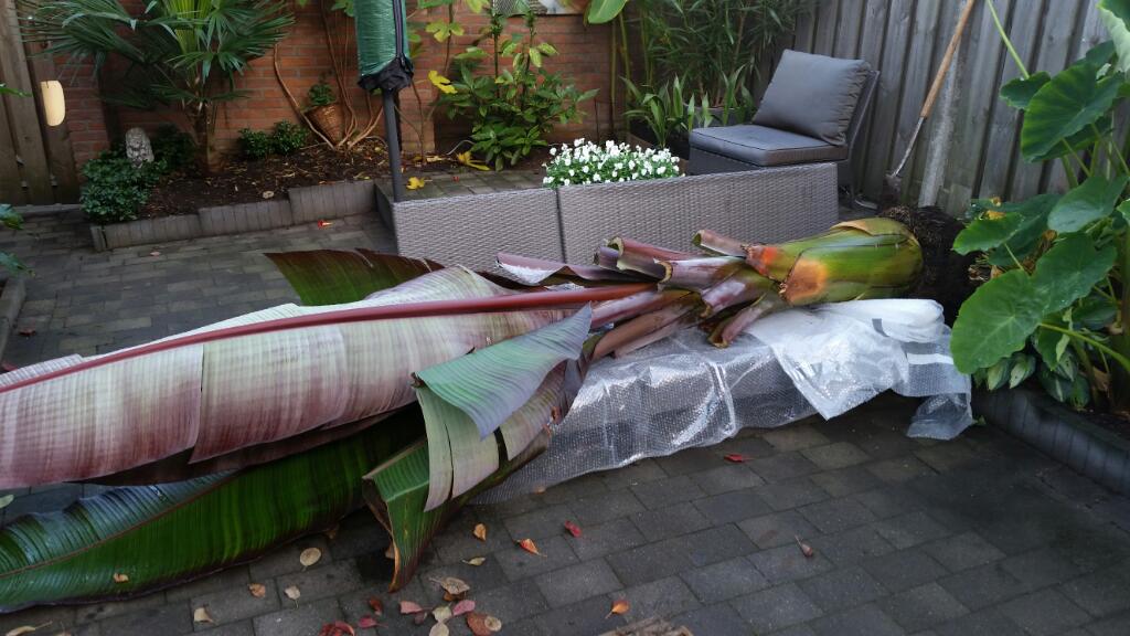 Jullie hebben wel een punt. Niet echt zo over nagedacht, want toen hij eindelijk op z'n plek lag was ik hem zo spuugzat dat ik hem gelijk aan een vriend heb aangeboden, die zei natuurlijk volmondig JA op een gratis plantje... Maar goed, nu heb ik volgend jaar meer ruimte om een beetje te schuiven met de planten en kan ik er misschien/waarschijnlijk weer een ander leuk plantje bij zetten, maar dan wel eentje die gewoon zonder enige vorm van bescherming kan blijven staan in de winter!!!!