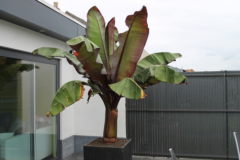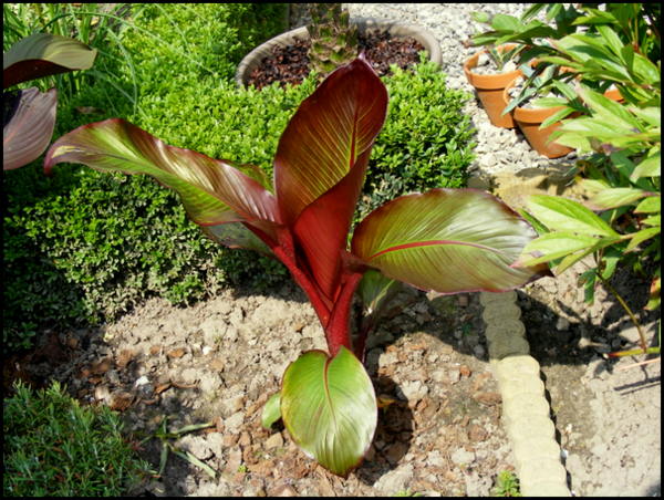 Links in beeld een groepje basjoo die met ruim 1 mtr stam op zolder heeft overwinterd en pas laat in het voorjaar de volle grond is ingegaan. Daarvoor zoveel als mogelijk was, in de volle zon en vaak aan moeten knippen