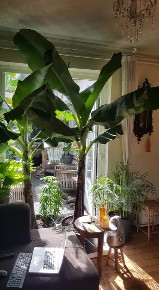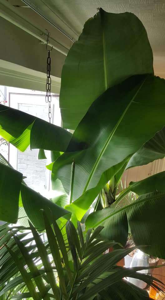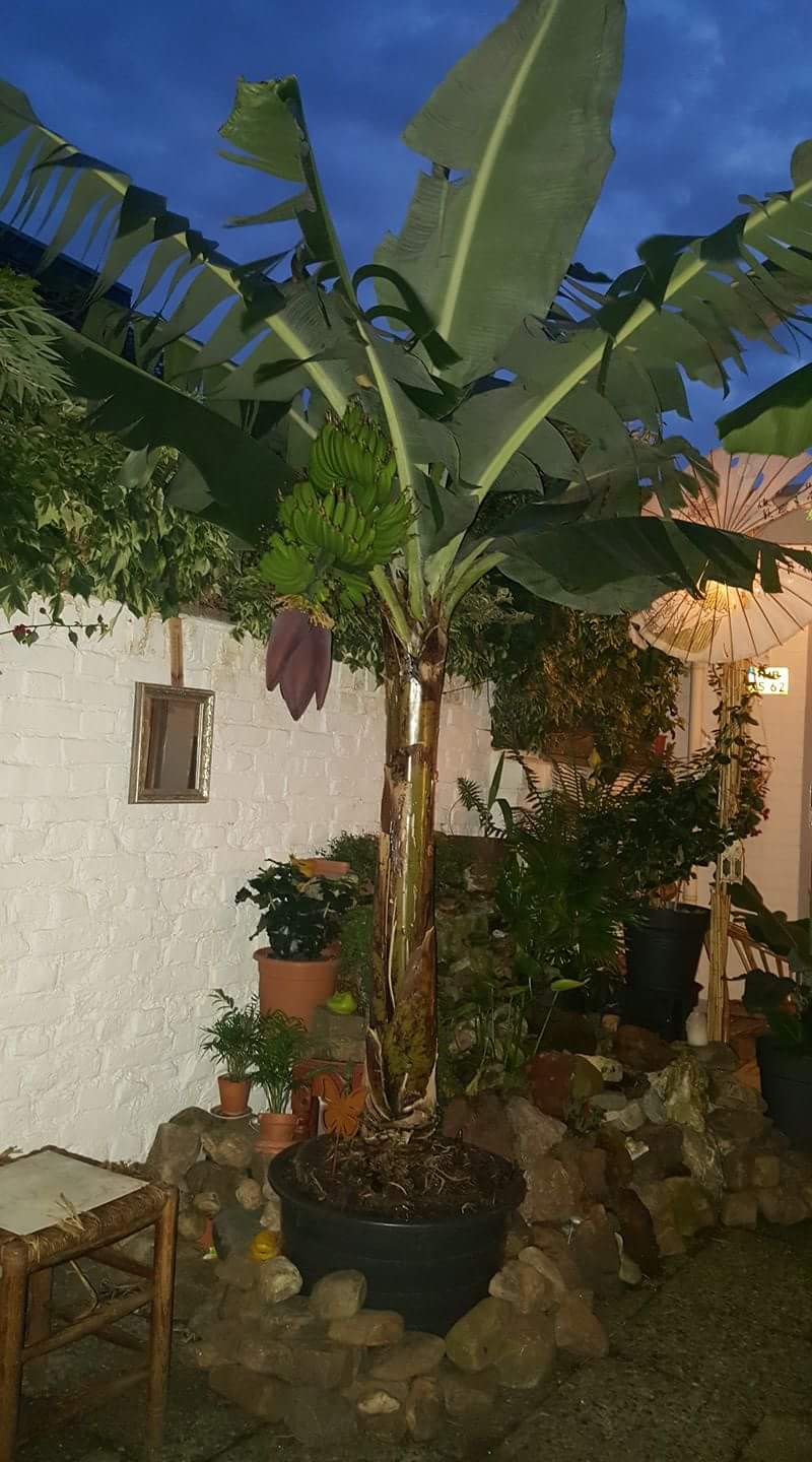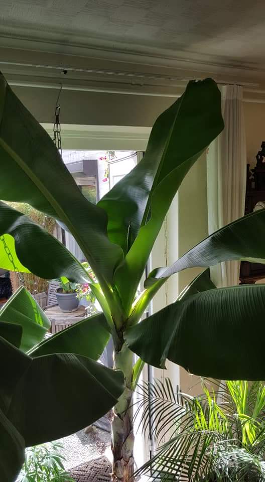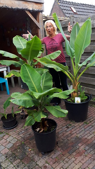 ik twijfel ontzettend wat voor cavandish ik nu heb, een dwarf of een super dwarf. I heb hem vanuit zaad (grote harde knikkers) uit tenerife opgekweekt. Op het zakje stond musa tenerife. Inmiddels is hij 3 of 4 jaar oud en de top van de bladeren komen tot ongeveer 1,5 meter. De stam is echter relatief kort, zo'n 50 cm. De wijnvlekken op de bladeren heb ik nooit gehad. Vorig jaar was de stam aan het eind van de zomer super mooi rood, dit jaar veel minder. Ook opvallend, ik heb nog nooit een pup gehad.