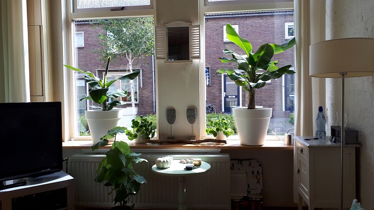 Ik wacht behoorlijk lang met het afknippen van de bladeren, pas als ze flink geel bruin zijn en hangen gaan ze er af, eerst direct na het blad, daarna knip ik de overgebleven steel steeds verder naar beneden af, tot onder aan de voet. Zou dit de reden kunnen zijn dat mijn banaan niet de lucht in gaat? Voordeel is wel dat ik hem nog een beetje naar binnen krijg komende winter.