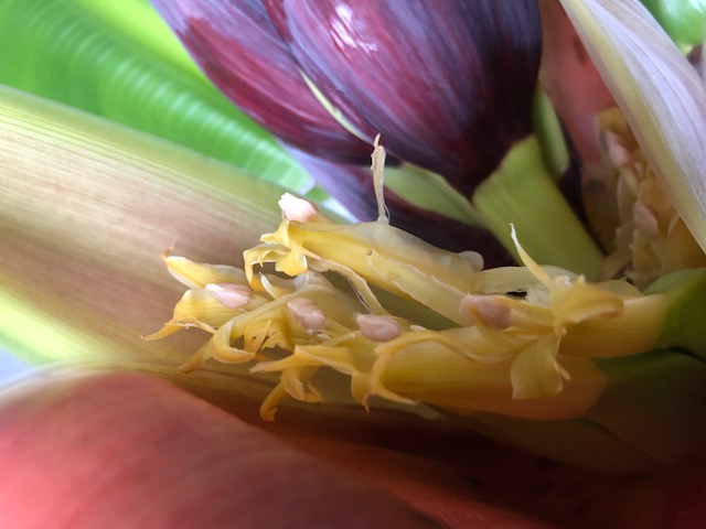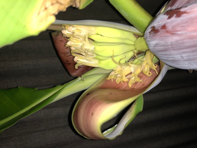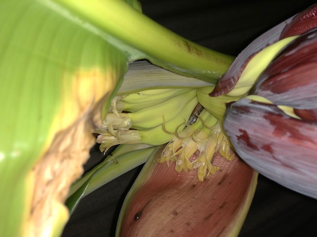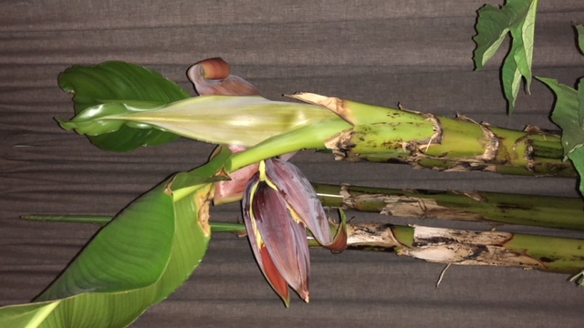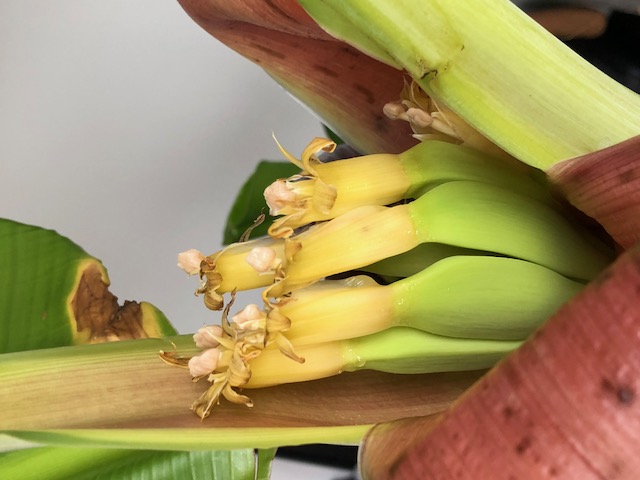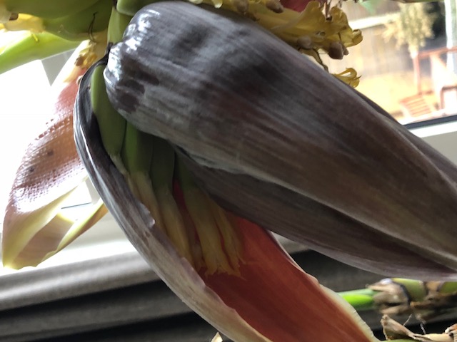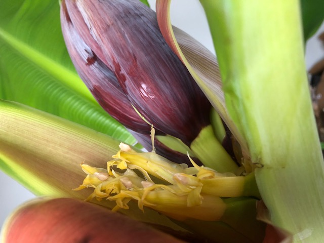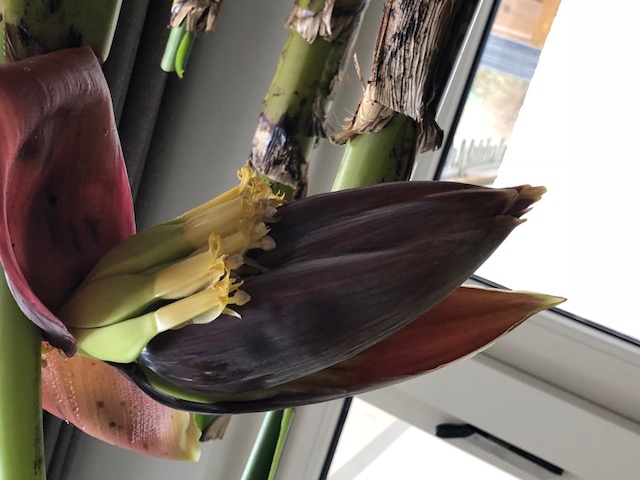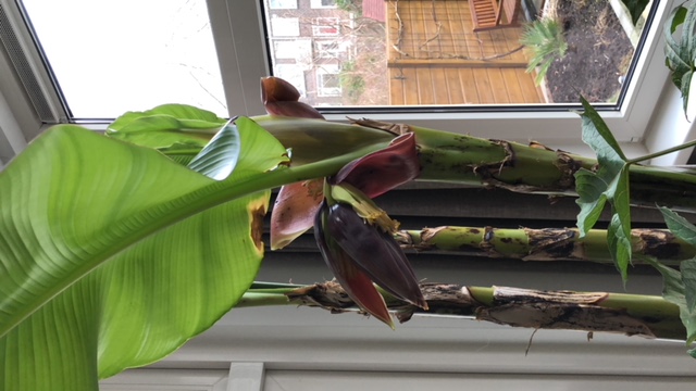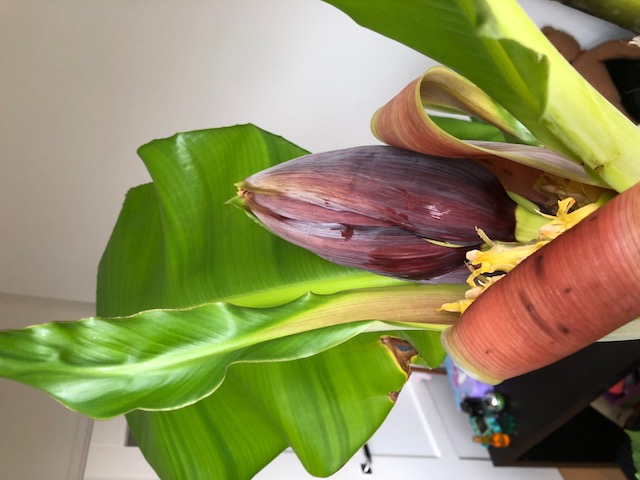 detail foto die laat zien waarom de laatste 2 bladeren ook problemen gaan krijgen. Mijn 1e bananen bloem, idd makkelijke banaan, in juni 2017 gekocht, nu al bloem op komst