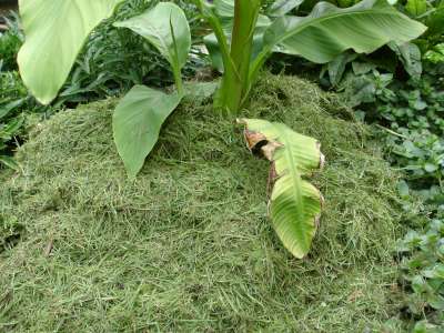De volgende keer (denk woensdag) zal ik mooi mijn afgereden gras tussen de banaantjes deponeren.