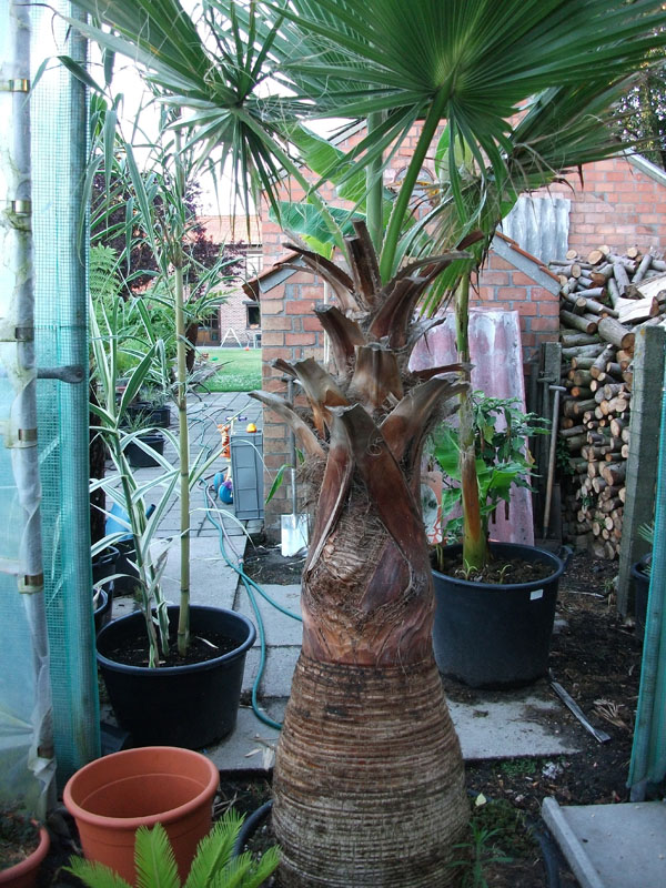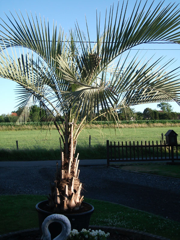 Vergeet niet dat TTP Exotics - tropthaipalms exotenshop opzich niet meer bestaat. Zie mij niet meer als zaakvoerder maar als voormalig zaakvoerder. Zolang ik hier nog in Belgie blijf zet ik mijn hobby verder tot ik definitief vertrek naar Thailand. Mijn website staat nog op het internet waarbij het rubriek palmen al maandenlang verwijderd is. Opzich zou ik heel mijn website moeten verwijderen maar ik wil de website behouden omdat Tropthaipalms zich verder actief zal vinden met een kwekerijd van collector items in Thailand voor export. Veel is er hier eigelijk niet meer te zien als je het vergelijkt met de voorbije jaren de zaak op volle toeren draaide. Wij hebben reeds een uitverkoop gedaan van alle palmen , en andere exoten. Alle palmen zijn verkocht. Wat niet wil zeggen dat ik geen grote palmen meer bezit voor mijn eigen want zolang ik hier nog blijf voor een definitief vertrek kan ik ze ook niet missen , ik kan namelijk niet leven zonder palmen , bananen en andere exoten rond me heen. Als voorbeeld hier een foto van mijn grote Butia Yatay en mijn grote Washingtonia.