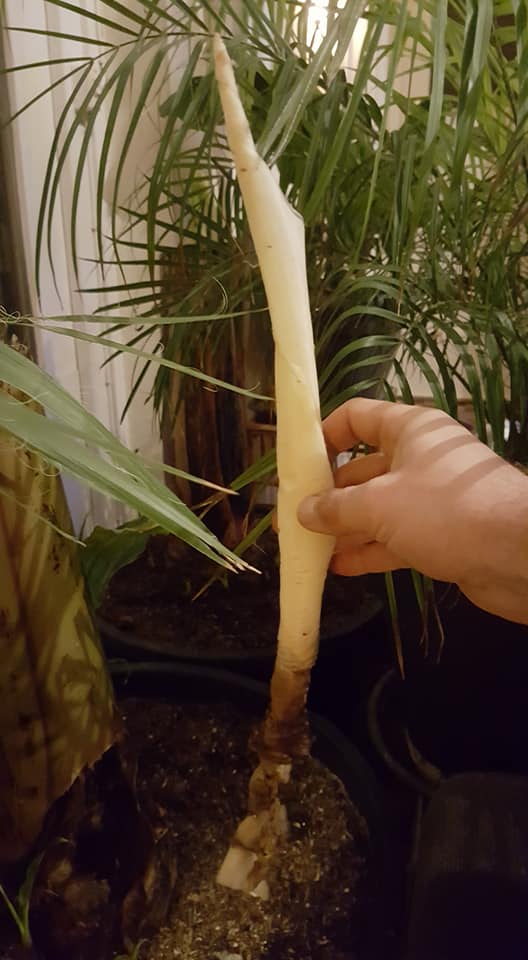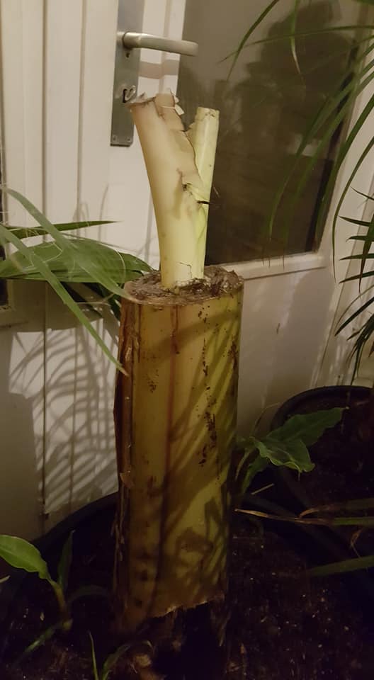 Onder het snijden zag ik dat er in de stam, het nieuwe blad daaronder als een harmonica in elkaar was gedrukt.