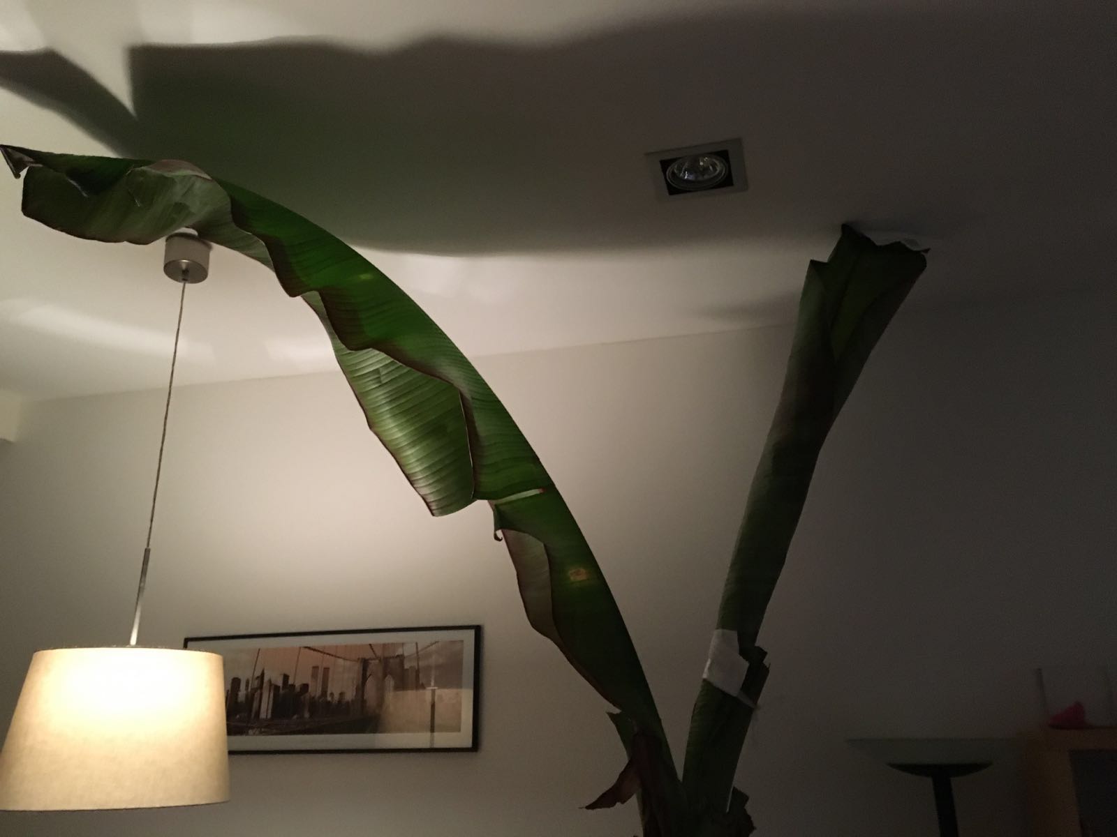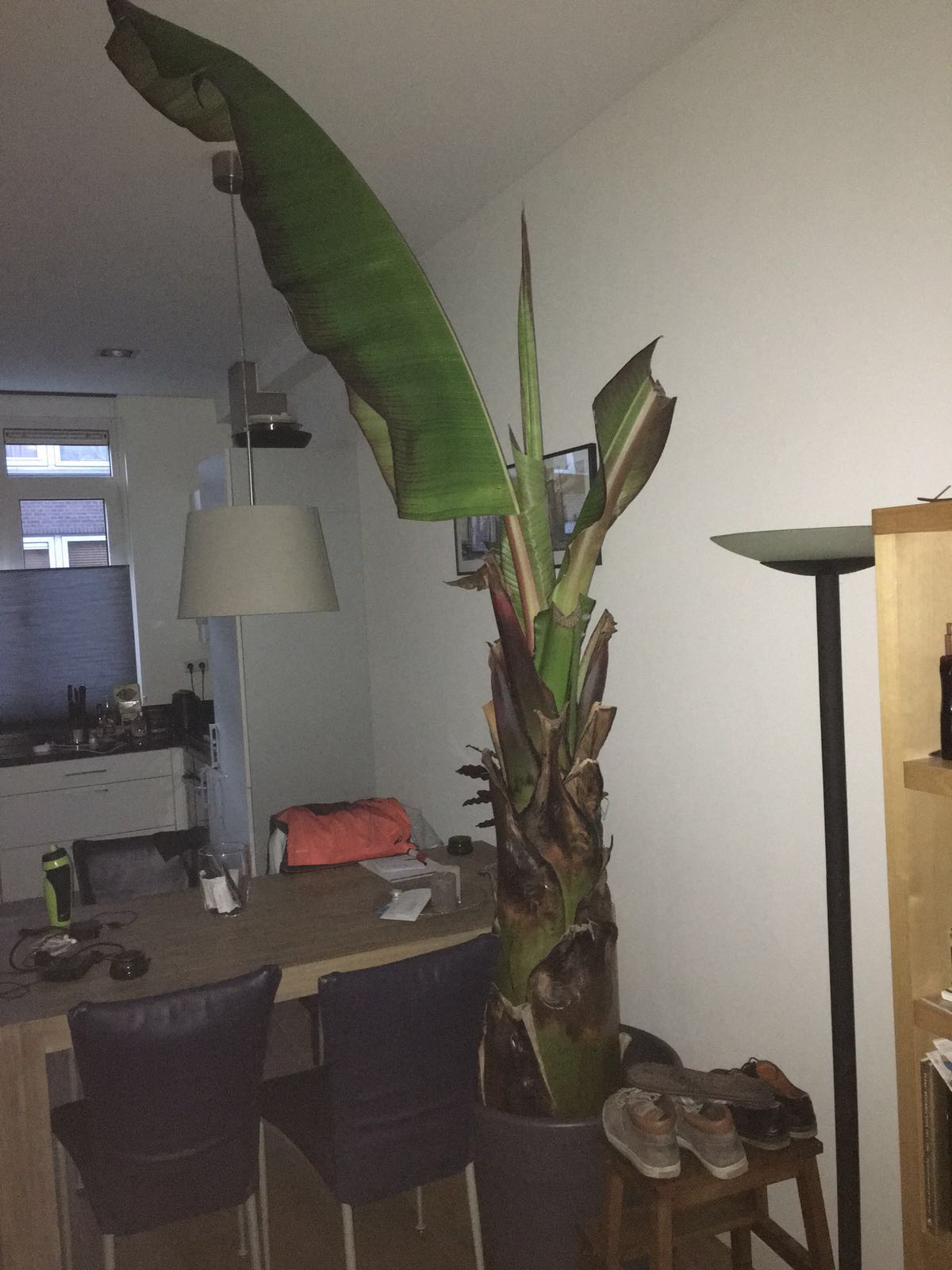 Helaas heb ik geen plaats waar hij vorstvrij kan overwinteren, maar ik heb hem tot een paar bladeren gesnoeid en zo lang mogelijk in een houten garage laten staan. Toen het ging vriezen heb ik hem toch net iets te laat naar binnen gehaald. De bladeren waren bruin en ook het bovenste deel van de speer was bruin. Ik heb alles afgesneden en toe in de woonkamer gezet.
