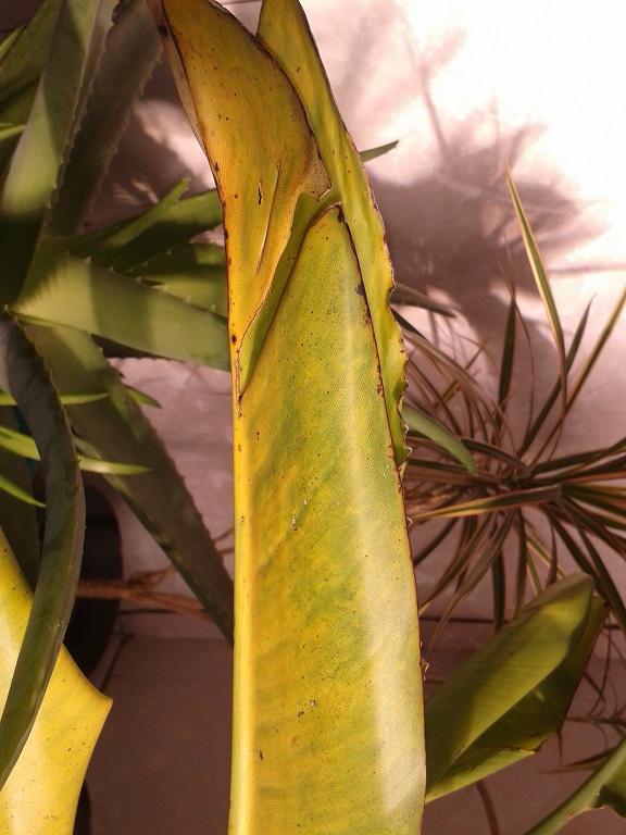 onderaan de bladeren zijn bruine vlekken, verschillende bladeren zijn bij elkaar gekruld.