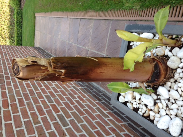 Ik ben al een hele tijd bezig met het kweken van de bananenplant Cavendish. Ik ben begonnen met 1 plantje te kopen in Gran Canaria 10 jaar geleden. Daarvan heb ik 2 pups gekregen die ik apart gezet heb. Die twee pups zijn ongeveer 7 jaar oud en zijn uitgegroeid tot mooie grote planten. Tot voor de winter stonden ze super mooi. (stam van 1 m en bladeren van meer dan 1m) maar geleidelijk aan zijn ze berg af gegaan. Deze winter zijn ze heel erg snel berg af gegaan. Tot ik op het drastische punt kwam om ze te 'onthoofden', omdat ze geen bladeren meer hadden en alles rot was, zelfs het nieuwe blad vertoonde al rottingverschijnselen ondanks het nog niet eens uitgerold was. (zie foto's) Ik wou hiermee bekomen dat de energie gegeven werd aan de nieuwe pups in plaats van een aftakelende moederplant.
