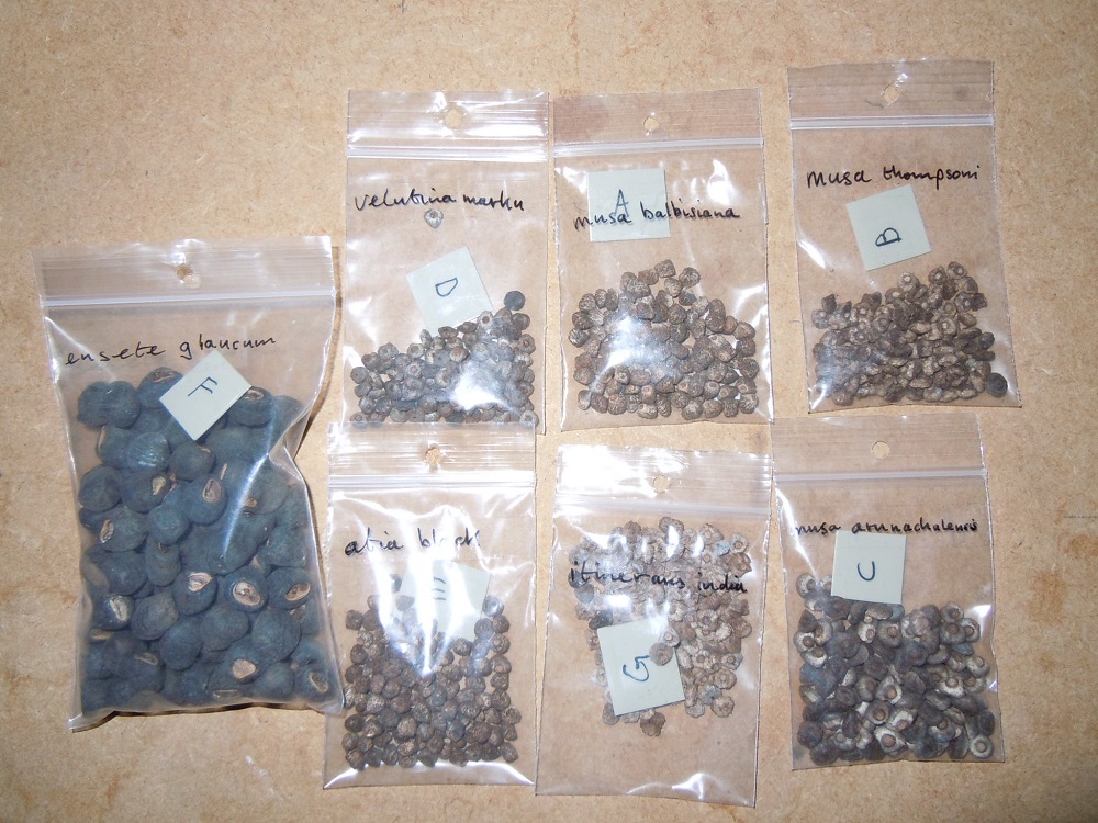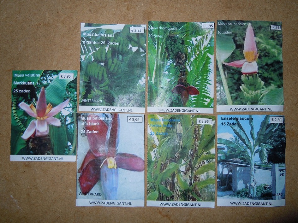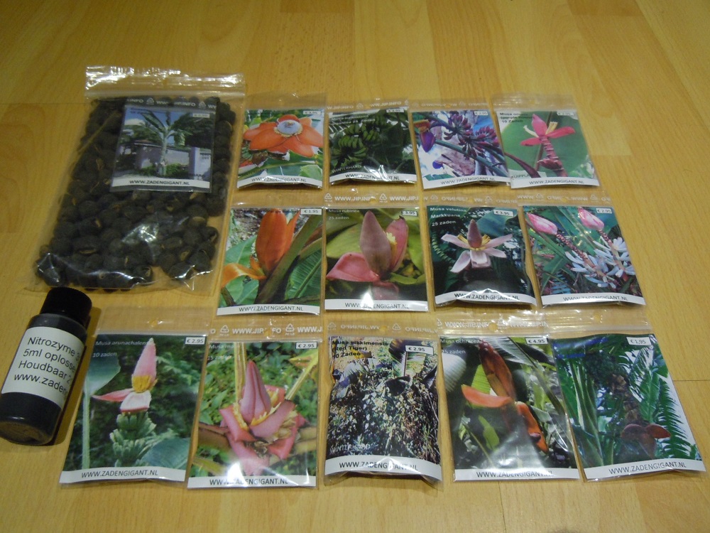 Daarbij ga ik ook de zaaibakken van vorig jaar opkuisen, naar binnen halen (die staan nog steeds in de kas als soort van koudeprikkel) voorzien van verse cocospeat en weer lekker warm weg zetten. Ervaringen uit voorgaande jaren bewezen wel degelijk dat banaanzaden zelfs na meer dan een jaar nog massaal kunnen kiemen dus we gaan er weer voor. Onderstaand de foto's van de binnengekomen zaden plus een soorten lijstje. De zaden zijn overigens net vers binnen gekomen uit India.