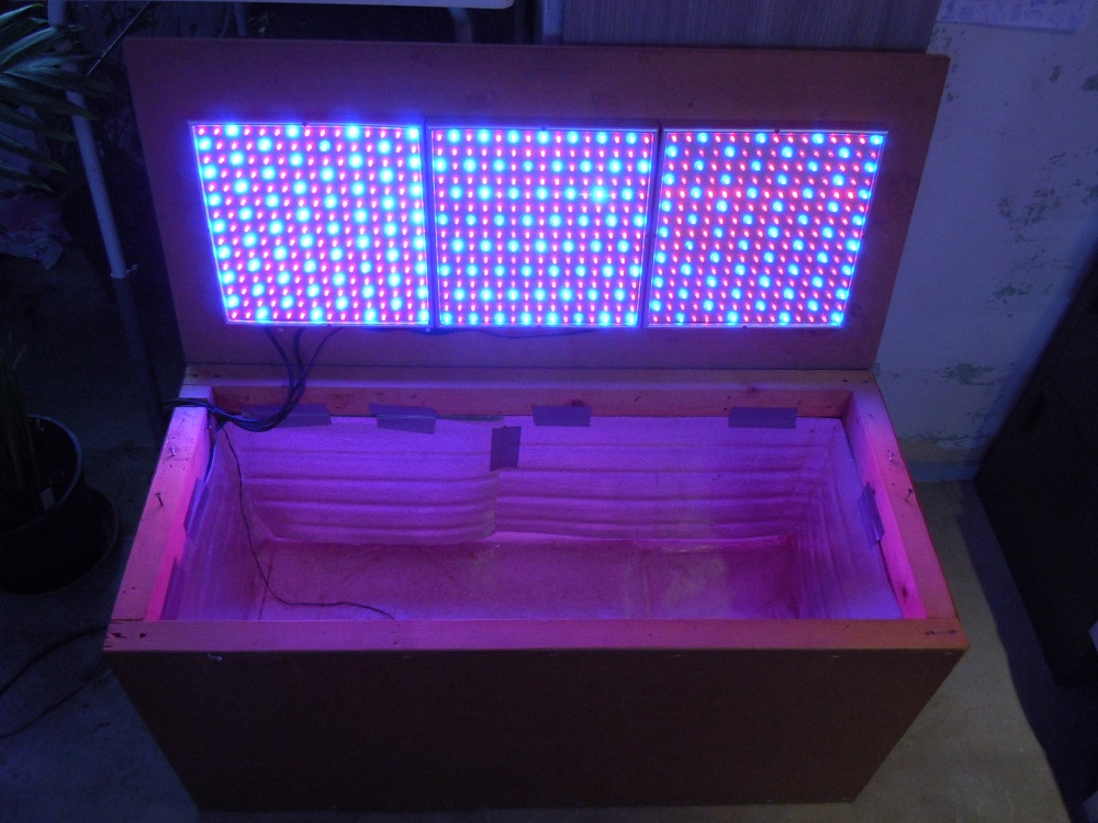 Onder de deksel heb ik 3 ledpaneeltjes hangen welke de gekiemde zaden kunnen laten opgroeien tot ze de bak uit mogen. 3x11 watt dus in totaal zo'n 60watt voor de gehele kweekbak.
