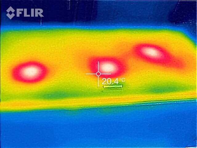 Hierboven het warmtebeeld van de geopende kweekbak. Duidelijk is te zien dat de ledpaneeltjes zelf ook best veel warmte produceren. De dunne witte lijntjes geven wat zaaibakken weer.