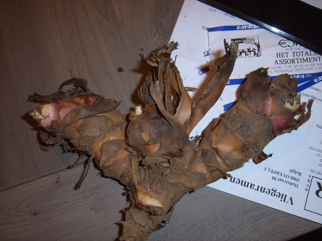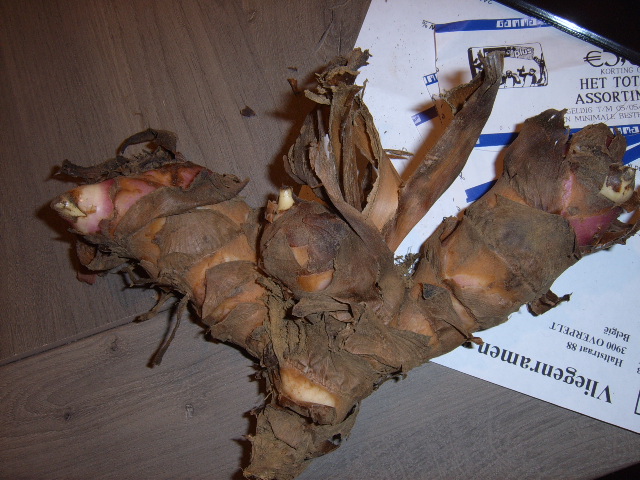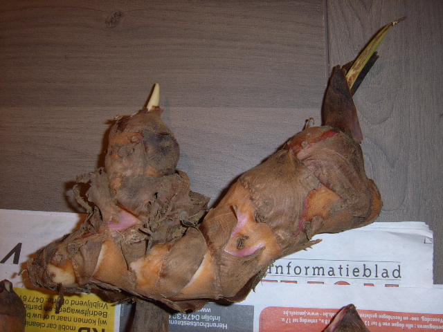 Zo heb ik hier een grote pol van C. Russian Red die we in het najaar met 2man uit de grond moeten tillen, maar deze wordt wel 2,5m hoog , tegenover de kleinere en zeker de pas gedeelde knollen die op 1,5m blijven steken.